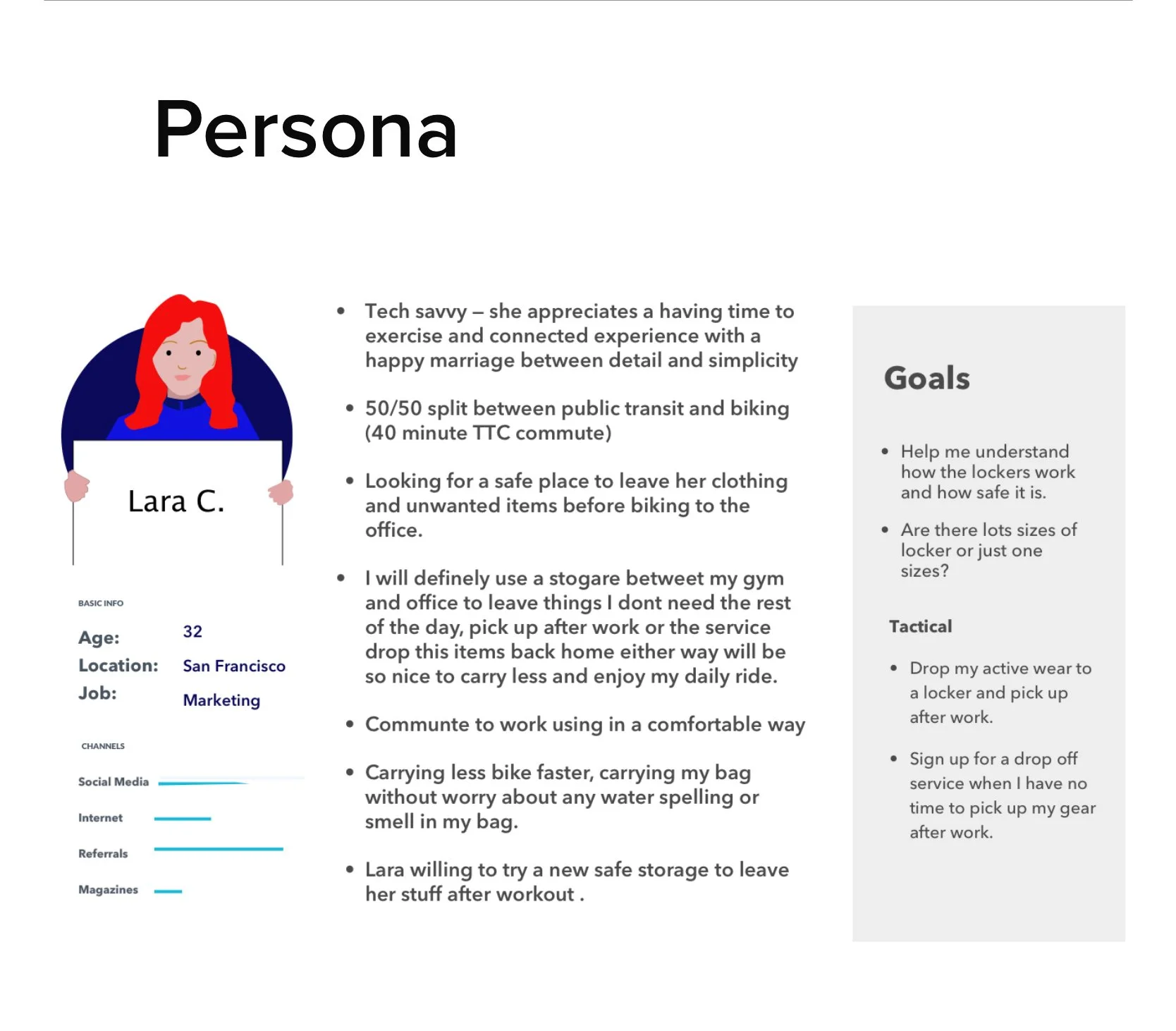 I develop a Persona to learn about our main user, This user is a full time employed living and working in San Francisco, he/ she commute to work in a bike everyday, he/she have activities before and after work such as: gym classes, network events /happy hour, book reading sessions and others.